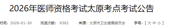 根據(jù)《中華人民共和國醫(yī)師法》《醫(yī)師資格考試暫行辦法》、山西省醫(yī)師資格考試領(lǐng)導(dǎo)小組辦公室公告(晉醫(yī)考辦〔2026〕1號),現(xiàn)將太原考點2026年醫(yī)師資格考試有關(guān)事項公告如下: