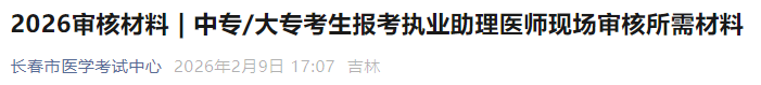 吉林長春考點官方發(fā)布2026年醫(yī)師資格考試中專/大專報考助理醫(yī)師審核所需材料!請相關(guān)考生及時查看,做好報名審核準備!