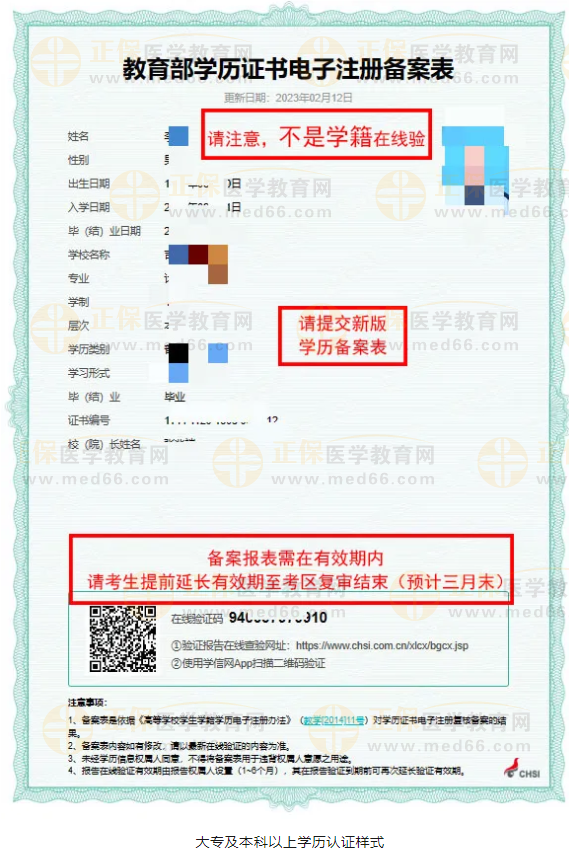 ●“學信網(wǎng)”打印的《教育部學歷證書電子注冊備案表》需最新版(必須在有效期內(nèi),因材料需要等待省審,考生需延長有效期至少3個月);