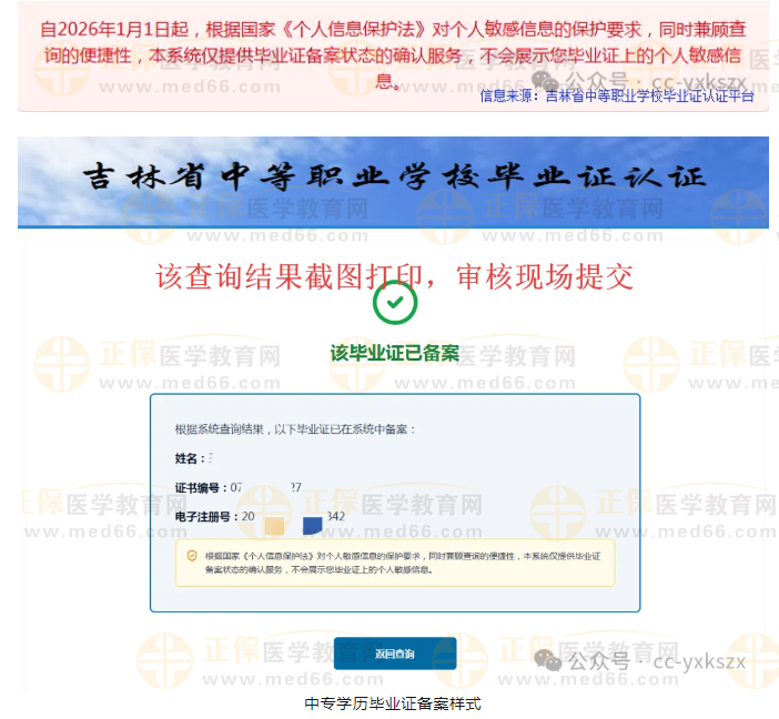 ●吉林省中專畢業(yè)證需打印畢業(yè)證備案狀態(tài)頁面截圖(新版),樣式如下(吉林省中等職業(yè)學校畢業(yè)證認證網(wǎng)址https://renzheng.jlipedu.cn/)
