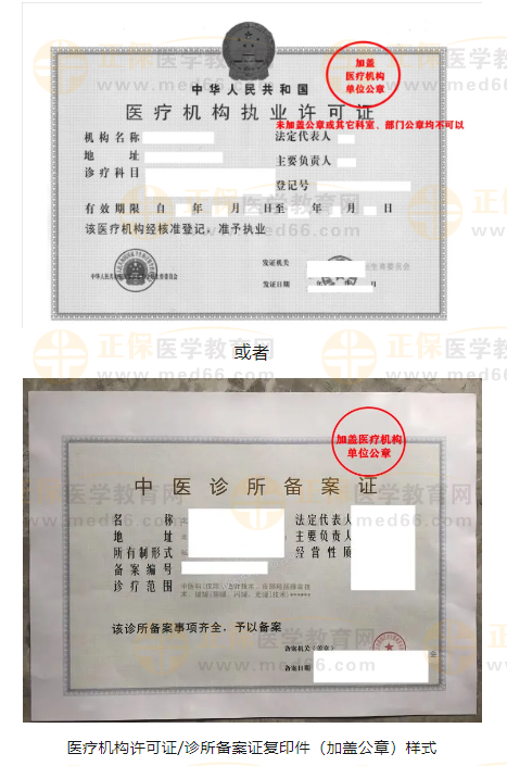 實踐單位醫(yī)療機構(gòu)許可證正本(或副本)/診所備案證的復印件1份,并加蓋醫(yī)療機構(gòu)單位公章;