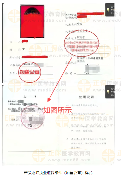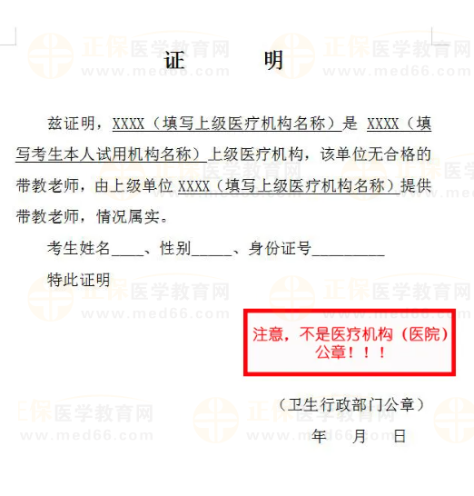 須用上級醫(yī)療機構(gòu)的帶教老師資格證與執(zhí)業(yè)證復印件并加蓋公章,工作實踐證明需加蓋上級機構(gòu)和本人所在單位公章各一個(兩個章),并出具醫(yī)聯(lián)體證明,并加蓋衛(wèi)生行政部門公章,無醫(yī)聯(lián)體證明的需填寫附件《上級醫(yī)療機構(gòu)出具帶教老師的證明》加蓋衛(wèi)生行政部門公章,附件下載方式見文末;