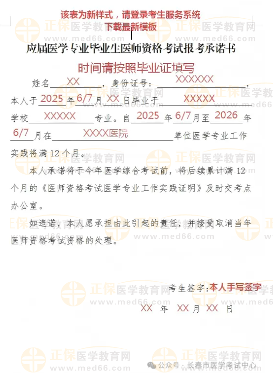 應屆畢業(yè)生還需提供《應屆醫(yī)學專業(yè)畢業(yè)生醫(yī)師資格考試報考承諾書》,請登錄國家醫(yī)學考試網(wǎng)考生服務系統(tǒng)下載(新版);