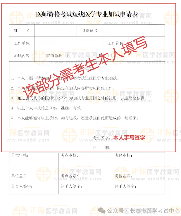 12.報考執(zhí)業(yè)醫(yī)師短線加試(院前急救、兒科)的考生還需提交《醫(yī)師資格考試短線醫(yī)學專業(yè)加試申請表》新版樣式如下(請登錄國家醫(yī)學考試網(wǎng)考生服務系統(tǒng)下載),軍事醫(yī)學加試無需填寫;