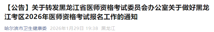 - · 黑龍江哈爾濱2026年醫(yī)師資格考試報(bào)名審核時間安排|材料要求