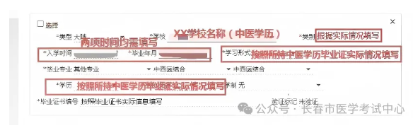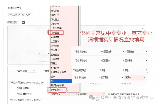 1.報考西學(xué)中類別:畢業(yè)專業(yè)填寫為“中西醫(yī)結(jié)合”(在其他專業(yè)中選擇)專業(yè),學(xué)制填“無”,學(xué)習(xí)形式填“按照所持中醫(yī)學(xué)歷畢業(yè)證實(shí)際情況填寫”,學(xué)歷填“按照中醫(yī)學(xué)歷實(shí)際情況填寫”,證書類型填“西醫(yī)執(zhí)業(yè)證”“西醫(yī)注冊證”及相應(yīng)編號。如圖填寫: