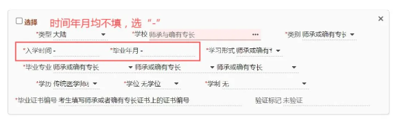 2.報考師承或確有專長類別:學(xué)習(xí)形式填“師承或確有專長”,報考學(xué)歷填“傳統(tǒng)醫(yī)學(xué)師承或確有專長”,學(xué)制填“無”,畢業(yè)學(xué)校填“師承或確有專長”,畢業(yè)專業(yè)填“師承或確有專長”,畢業(yè)年月不填,選“-”,畢業(yè)證編號按實(shí)際填寫。如圖填寫: