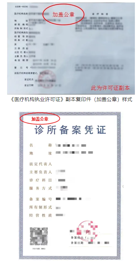 ●醫(yī)療機(jī)構(gòu)升級的,副本后有加注升級的說明即可(加蓋公章),如沒有則需要提供衛(wèi)生行政部門開具的證明以說明原機(jī)構(gòu)與現(xiàn)機(jī)構(gòu)是同一醫(yī)療機(jī)構(gòu)。