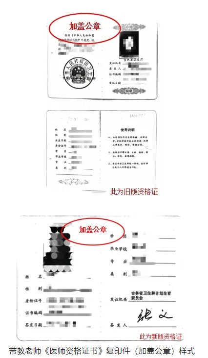 7.帶教老師《醫(yī)師執(zhí)業(yè)證書》(即注冊證)復(fù)印件,并加蓋公章(照片頁、個人信息頁及變更注冊記錄頁需復(fù)印完整。如果字跡不能看清,需提交帶教老師執(zhí)業(yè)證書原件)。