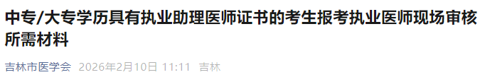 吉林市考點官方發(fā)布2026年醫(yī)師資格考試中專/大專學(xué)歷助理考執(zhí)業(yè)現(xiàn)場審核所需材料!請相關(guān)考生及時查看,做好報名審核準(zhǔn)備!