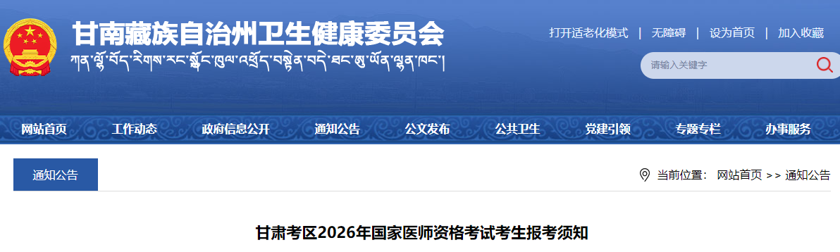 根據(jù)《國家衛(wèi)生健康委員會醫(yī)師資格考試委員會公告》(2026年第1號),依據(jù)《中華人民共和國醫(yī)師法》和《醫(yī)師資格考試暫行辦法》規(guī)定,現(xiàn)將甘肅考區(qū)2026年國家醫(yī)師資格考試考生報(bào)名有關(guān)事項(xiàng)通知如下: