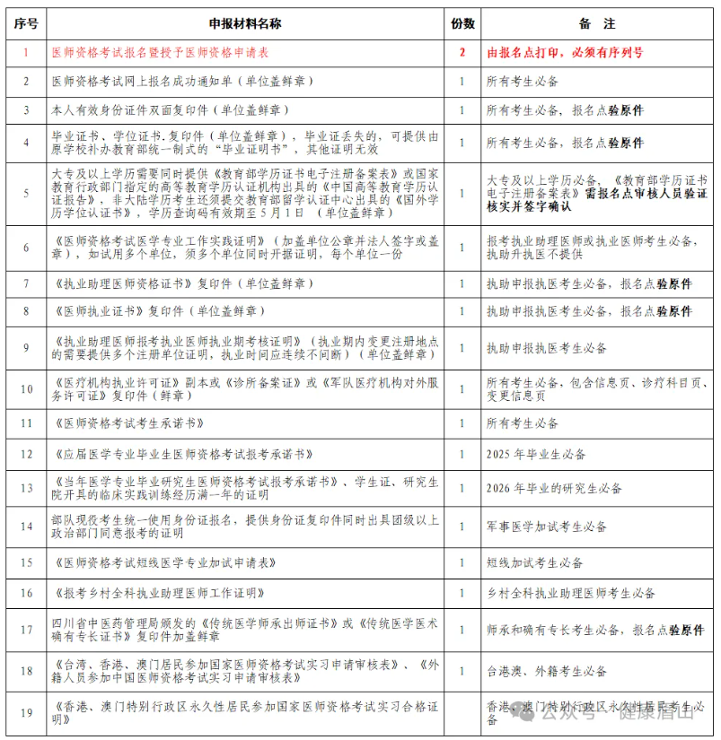 (1)考生根據(jù)個人報考情況按要求提交材料。資料按照表內(nèi)順序排列,由報名點負責裝訂整齊。復印件要求完整、清晰,提交的復印件一律使用A4紙張,其原件均由所在的醫(yī)療機構(gòu)及各報名點核驗,并在復印件上加蓋所在醫(yī)療機構(gòu)公章。