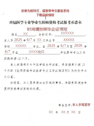 8.2025年應(yīng)屆畢業(yè)生還需提供《應(yīng)屆醫(yī)學(xué)專業(yè)畢業(yè)生醫(yī)師資格考試報(bào)考承諾書》,請(qǐng)登錄國(guó)家醫(yī)學(xué)考試網(wǎng)考生服務(wù)系統(tǒng)下載(新版);