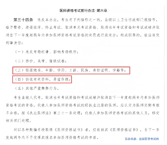 三、考生務(wù)必對(duì)本人報(bào)考信息、審核材料真實(shí)性負(fù)責(zé),使用虛假信息、提供虛假材料報(bào)名的,將根據(jù)《醫(yī)師資格考試暫行辦法》第六章第34條進(jìn)行處理。審核期間對(duì)醫(yī)學(xué)專業(yè)工作實(shí)踐證明/試用期考核證明存疑的,考生應(yīng)按所在考區(qū)考點(diǎn)要求提供相應(yīng)輔助證明材料。