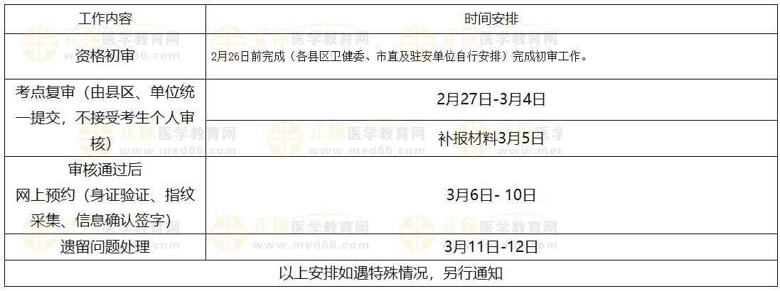 各縣區(qū)衛(wèi)生健康委、市直及駐安醫(yī)療衛(wèi)生單位根據(jù)考點(diǎn)復(fù)審時(shí)間負(fù)責(zé)組織本轄區(qū)、本單位考生的報(bào)名與材料初審工作,并于2月26日前完成,時(shí)間自行安排。