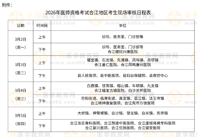2026年3月2日—2026年3月5日(上午8:30-11:30,下午14:30-17:30),具體時(shí)間安排按2026年醫(yī)師資格考試合江地區(qū)考生現(xiàn)場(chǎng)審核日程表執(zhí)行(詳見(jiàn)附件)。