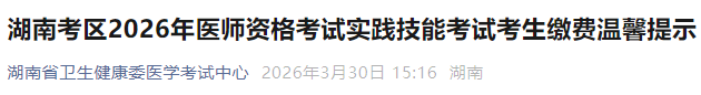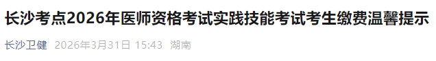 湖南長(zhǎng)沙2026年醫(yī)師資格考試實(shí)踐技能繳費(fèi)入口已開(kāi)通!以下為湖南長(zhǎng)沙考點(diǎn)官方提醒,請(qǐng)相關(guān)考生仔細(xì)查看,按時(shí)完成技能繳費(fèi)!