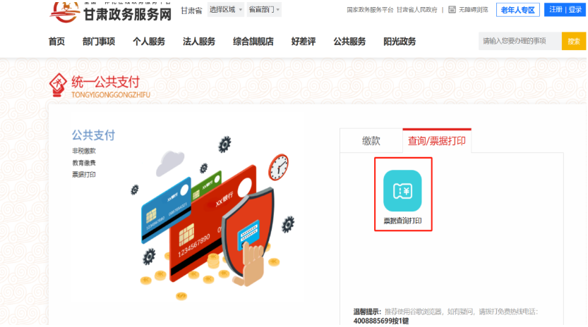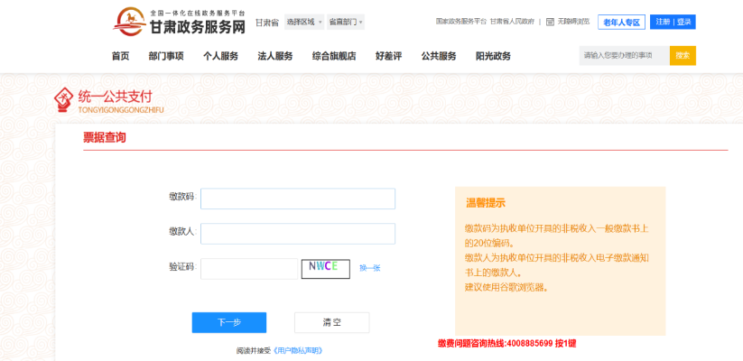 4.進(jìn)入甘肅政務(wù)服務(wù)網(wǎng)-統(tǒng)一支付平臺(tái)-查詢/票據(jù)打印,輸入繳款碼(注:繳款碼根據(jù)圖5上的繳款碼信息進(jìn)行保留)、繳款人(注:繳款人為考試報(bào)名系統(tǒng)登錄賬號(hào))進(jìn)行電子票據(jù)的查詢打印,如圖11、圖12、圖13所示。
