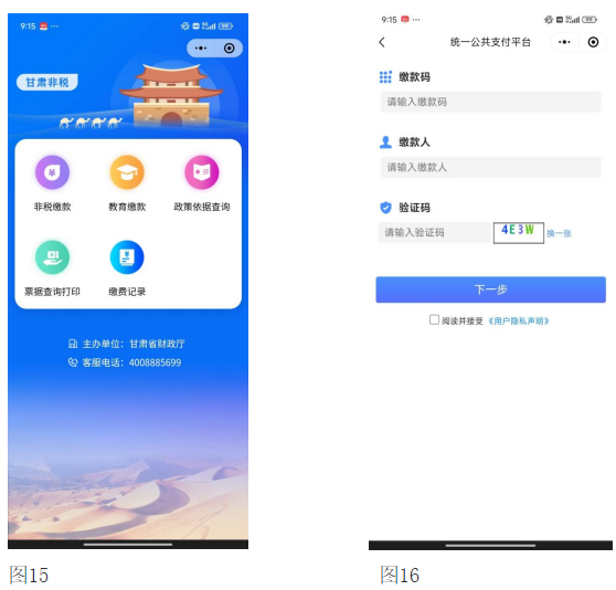 6.微信、支付寶小程序關(guān)注“甘肅非稅”,在票據(jù)查詢打印功能進(jìn)行查詢打印票據(jù),如圖15、圖16所示。