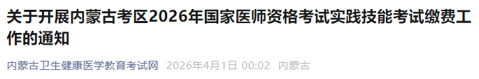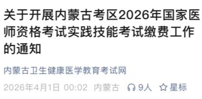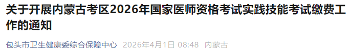 內(nèi)蒙古包頭2026年醫(yī)師資格考試實踐技能繳費入口已開通!以下為內(nèi)蒙古考區(qū)官方提醒,請相關(guān)考生仔細查看,按時完成技能繳費!