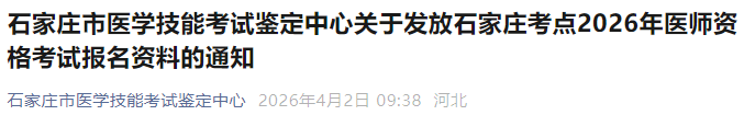 河北石家莊2026年醫(yī)師資格考試報名資料4月7日起發(fā)放,速填郵寄信息!以下為河北石家莊考點(diǎn)官方提醒,請相關(guān)考生及時查看。