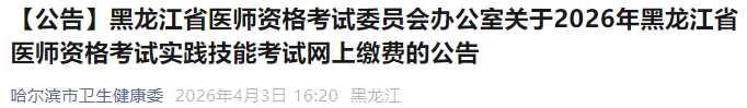 黑龍江哈爾濱2026年醫(yī)師資格考試實(shí)踐技能繳費(fèi)入口已開通!