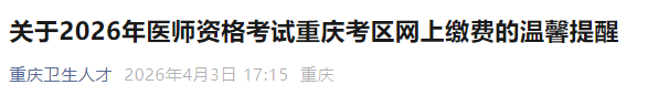 重慶市2026年醫(yī)師資格考試實(shí)踐技能繳費(fèi)入口已開通!以下為重慶市官方提醒,請相關(guān)考生仔細(xì)查看,按時(shí)完成技能繳費(fèi)!