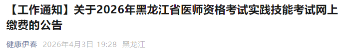 黑龍江伊春2026年醫(yī)師資格考試實(shí)踐技能繳費(fèi)4月12日截止!以下為黑龍江伊春考點(diǎn)官方提醒,請(qǐng)相關(guān)考生仔細(xì)查看,按時(shí)完成技能繳費(fèi)!