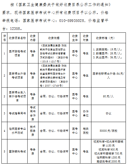 國(guó)家醫(yī)學(xué)考試中心2020年醫(yī)師資格考試報(bào)名收費(fèi)目錄公示