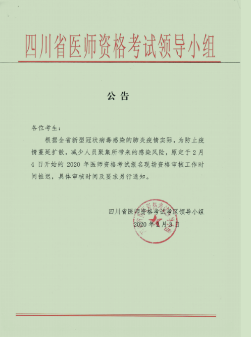 四川樂山關(guān)于推遲2020年醫(yī)師資格考試報(bào)名現(xiàn)場資格審核工作的公告