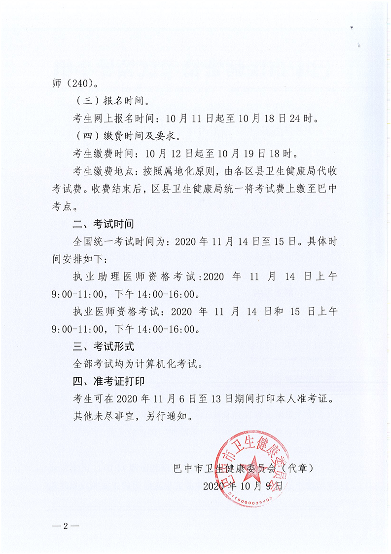 2020年巴中市執(zhí)業(yè)醫(yī)師“二試”考試報(bào)名繳費(fèi)通知