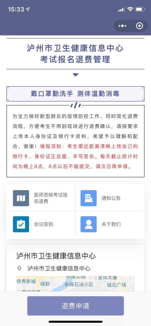 退費方式:為全力做好新冠肺炎的疫情防控工作,同時簡化退費流程,方便考生不用到現(xiàn)場進行退費確認,考生用手機微信掃描退費管理二維碼,進行退費申請,填寫考生信息后提交,市醫(yī)師資格考試考點辦公室審核后將退領(lǐng)金額轉(zhuǎn)入考生登記銀行卡(必須是考生本人銀行卡)。