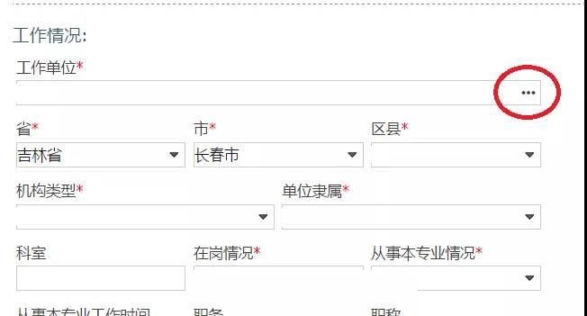 進入報名系統(tǒng),第四部“工作情況”中,選擇“工作單位”項右側(cè)省略號