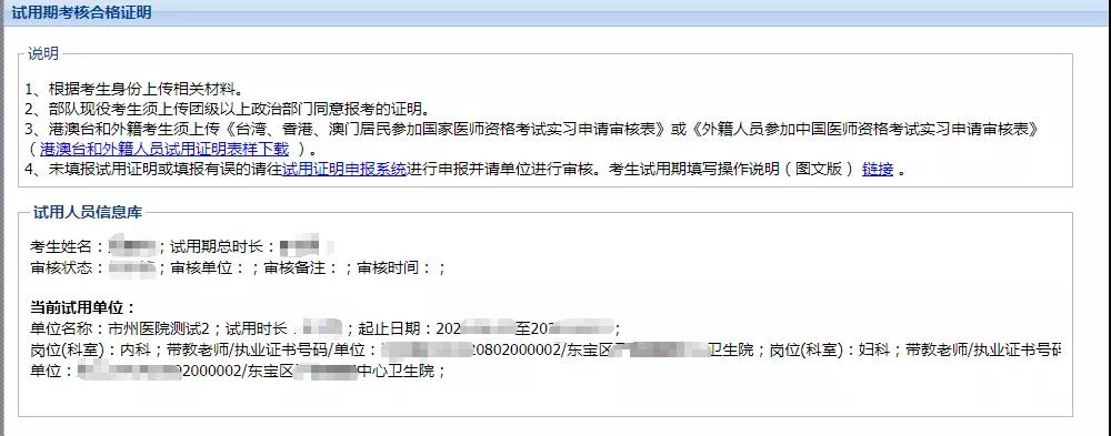 我省啟用線上網(wǎng)絡(luò)方式進(jìn)行試用期考核證明申報,考生需提供當(dāng)年試用期滿一年并考核合格的證明,試用機構(gòu)對考生提交信息進(jìn)行審核及確認(rèn)。在國家醫(yī)師資格考試報名時,考生報名將于試用期系統(tǒng)信息校對核驗,凡平臺內(nèi)無信息的試用人員不得參加當(dāng)年醫(yī)師資格考試。報名前,務(wù)必先進(jìn)行試用期申報,否則無法進(jìn)入報名環(huán)節(jié)。試用期申報內(nèi)容及步驟詳見以下通知。