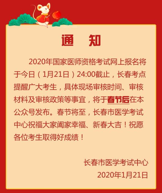 2020年醫(yī)師資格考試網(wǎng)上報名將于今日(1月21日)24時截止,請抓緊時間報名,審核事宜將于春節(jié)后在“長春市醫(yī)學(xué)考試中心”公眾號發(fā)布!