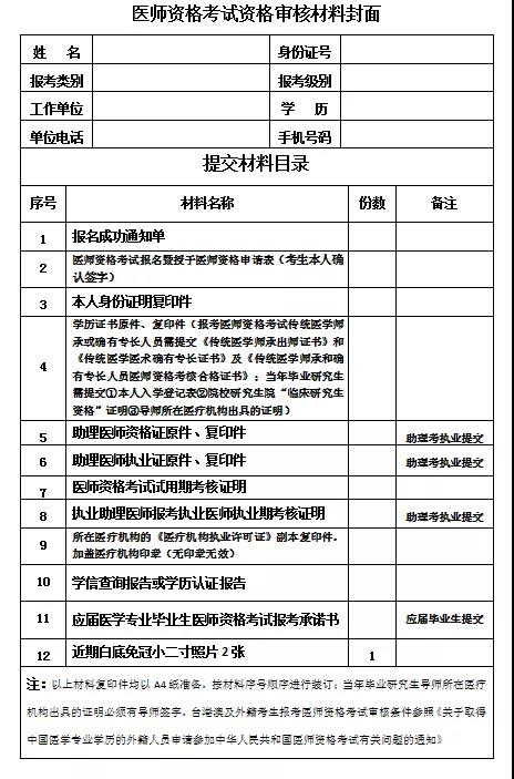 一、現(xiàn)場(chǎng)審核時(shí)間在疫情防控期間,為減少人員聚集,縮短等候時(shí)間,具體時(shí)間如下:4月29日:縣中醫(yī)院、婦幼保健計(jì)劃生育服務(wù)中心、個(gè)體診所;4月30日:社區(qū)衛(wèi)生服務(wù)中心(站)、鄉(xiāng)鎮(zhèn)衛(wèi)生院、村衛(wèi)生室。二、現(xiàn)場(chǎng)審核地點(diǎn)多倫縣衛(wèi)生健康委醫(yī)政醫(yī)管股,聯(lián)系電話:0479-4525938。2020年5月27日--6月5日,繳費(fèi)網(wǎng)址:國(guó)家醫(yī)學(xué)考試網(wǎng)http://www.nmec.org.cn。4.畢業(yè)證書(shū)原件及復(fù)印件(報(bào)考醫(yī)師資格考試傳統(tǒng)醫(yī)學(xué)師承或確有專(zhuān)長(zhǎng)人員需提交《傳統(tǒng)醫(yī)學(xué)師承出師證書(shū)》和《傳統(tǒng)醫(yī)學(xué)醫(yī)術(shù)確有專(zhuān)長(zhǎng)證書(shū)》及《傳統(tǒng)醫(yī)學(xué)師承和確有專(zhuān)長(zhǎng)人員醫(yī)師資格考核合格證書(shū)》;當(dāng)年畢業(yè)研究生需提交①本人入學(xué)登記表②院校研究生院“臨床研究生資格”證明③導(dǎo)師所在醫(yī)療機(jī)構(gòu)出具的證明);5.執(zhí)業(yè)助理醫(yī)師申報(bào)執(zhí)業(yè)醫(yī)師考試的,還須提交執(zhí)業(yè)助理醫(yī)師《醫(yī)師資格證書(shū)》、《醫(yī)師執(zhí)業(yè)證書(shū)》原件及復(fù)印件; 6.考生試用(或?qū)嵙?xí))機(jī)構(gòu)出具的《醫(yī)師資格考試試用期考核證明》;7.《執(zhí)業(yè)助理醫(yī)師報(bào)考執(zhí)業(yè)醫(yī)師執(zhí)業(yè)期考核證明》(如在執(zhí)業(yè)注冊(cè)過(guò)程中有變更記錄,導(dǎo)致注冊(cè)時(shí)間不滿(mǎn)足報(bào)考年限的,須提供首次執(zhí)業(yè)注冊(cè)證明);8.工作單位是醫(yī)療機(jī)構(gòu)的,還須提交該機(jī)構(gòu)《醫(yī)療機(jī)構(gòu)執(zhí)業(yè)許可證》副本復(fù)印件,加蓋醫(yī)療機(jī)構(gòu)印章(無(wú)印章無(wú)效);9.2002年以后畢業(yè)的大專(zhuān)學(xué)歷以上的考生需提供學(xué)歷認(rèn)證報(bào)告;10.應(yīng)屆畢業(yè)生還須填寫(xiě)《應(yīng)屆醫(yī)學(xué)專(zhuān)業(yè)畢業(yè)生醫(yī)師資格考試報(bào)考承諾書(shū)》;11.考生近期(6個(gè)月內(nèi))小2寸白底證件照2張,考生一定要把照片上面寫(xiě)上名字和電話裝在小袋子里與國(guó)家醫(yī)師資格申請(qǐng)表和報(bào)名成功確認(rèn)單用曲別針別在一起;12.如報(bào)考兒科或院前急救加試,還需提供醫(yī)療機(jī)構(gòu)開(kāi)具的崗位證明。1.請(qǐng)各位考生提前準(zhǔn)備好現(xiàn)場(chǎng)審核時(shí)需提交的相關(guān)材料,按材料序號(hào)順序進(jìn)行排列整理,放入紙質(zhì)檔案袋,正面粘貼《醫(yī)師資格考試審核材料封面》,封面內(nèi)容填寫(xiě)齊全(報(bào)考類(lèi)別為中醫(yī)、臨床、公衛(wèi)、口腔;報(bào)考級(jí)別為執(zhí)業(yè)醫(yī)師、助理醫(yī)師、鄉(xiāng)村全科執(zhí)業(yè)助理醫(yī)師)。2.請(qǐng)各位考生做好個(gè)人防護(hù)(佩戴口罩),進(jìn)入現(xiàn)場(chǎng)審核場(chǎng)所前進(jìn)行體溫檢測(cè),對(duì)非戶(hù)籍地考生進(jìn)行健康通行碼驗(yàn)證。4.考生在等候?qū)徍藭r(shí)保持1米以上距離。5.現(xiàn)場(chǎng)審核時(shí)要認(rèn)真核對(duì)考生個(gè)人信息(特別是身份證、學(xué)歷的真實(shí)性和有效性),確保網(wǎng)上報(bào)名系統(tǒng)與紙質(zhì)材料一致,國(guó)家醫(yī)考中心不再受理2017年及以后考生因個(gè)人填報(bào)信息錯(cuò)誤的信息修改。6.現(xiàn)場(chǎng)審核時(shí)必須仔細(xì)核對(duì)系統(tǒng)內(nèi)考生填報(bào)內(nèi)容的邏輯關(guān)系,審核無(wú)誤后現(xiàn)場(chǎng)為考生打印《醫(yī)師資格考試報(bào)名暨授予醫(yī)師資格申請(qǐng)表》,并由審核人員和考生簽字。