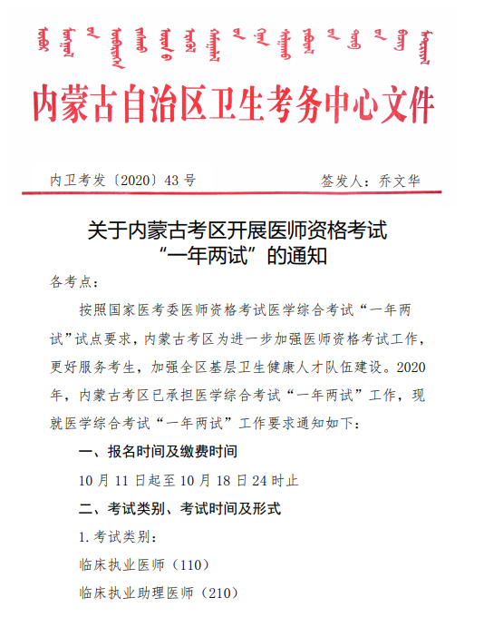 內(nèi)蒙古考區(qū)2020年醫(yī)師資格考試醫(yī)學(xué)綜合筆試“一年兩試”網(wǎng)上報(bào)名及繳費(fèi)的通知