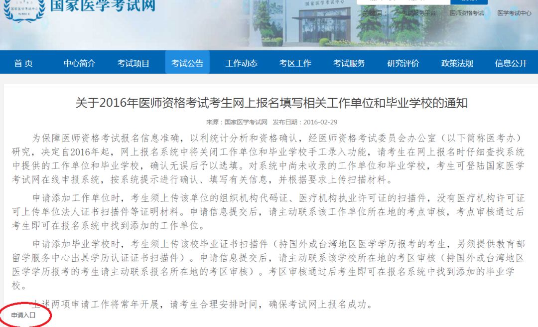 關(guān)于“長春市醫(yī)考中心:填不上工作單位?醫(yī)師資格考試報名申請?jiān)鲅a(bǔ)衛(wèi)生機(jī)構(gòu)流程”,相信不少考生十分關(guān)注,醫(yī)學(xué)教育網(wǎng)編輯整理具體內(nèi)容分享如下:
