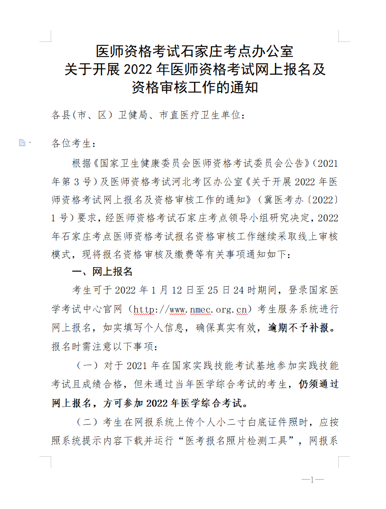 附件: 醫(yī)師資格考試石家莊考點辦公室關(guān)于開展2022年醫(yī)師資格考試網(wǎng)上報名及資格審核工作的通知