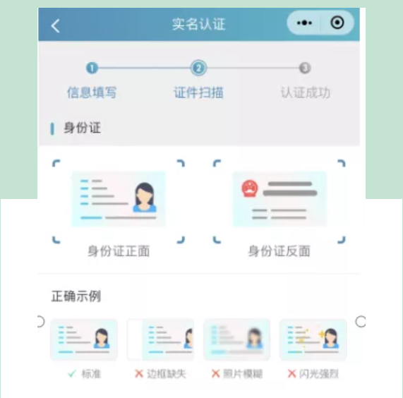 (1)選擇身份證后需要進(jìn)行證件掃描,請嚴(yán)格按照示例進(jìn)行操作,如果掃描次數(shù)過多我們會提示進(jìn)行人工審核流程