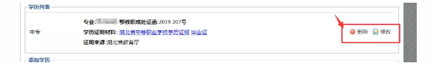 如需對(duì)學(xué)歷進(jìn)行修改或刪除,請(qǐng)點(diǎn)擊原學(xué)歷后“修改”和“刪除”重新填寫。