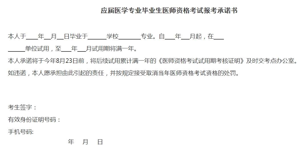 8、《應屆醫(yī)學專業(yè)畢業(yè)生醫(yī)師資格考試報考承諾書》1份(附表四)