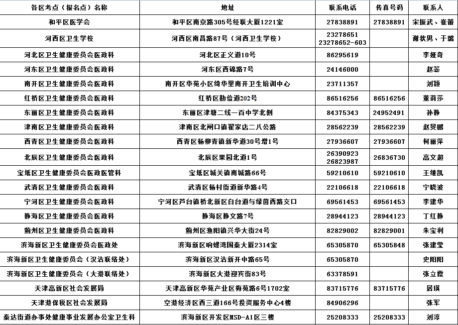 附件下載:2019年醫(yī)師資格考試天津考區(qū)各區(qū)報(bào)名點(diǎn)地址及聯(lián)系電話一覽表.xls