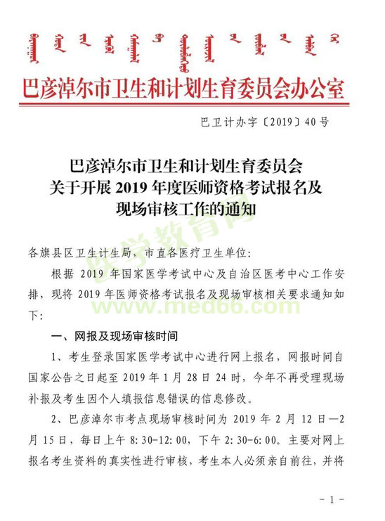 “內(nèi)蒙古巴彥淖爾市關(guān)于2019年度醫(yī)師資格考試報(bào)名及現(xiàn)場審核工作的通知”的內(nèi)容,由醫(yī)學(xué)教育網(wǎng)編輯整理搜集,希望對想要了解相關(guān)問題的人提供幫助。