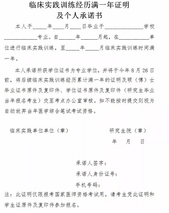 4、研究生院開(kāi)具的臨床實(shí)踐訓(xùn)練經(jīng)歷滿一年證明及個(gè)人承諾書1份(見(jiàn)本文附件,國(guó)家醫(yī)學(xué)考試網(wǎng)下載無(wú)效)。