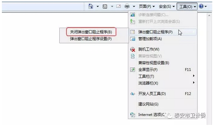 在菜單中選擇“工具->彈出窗口阻止程序”,如果二級菜單顯示“關(guān)閉彈出窗口阻止程序”,則點擊此菜單。如下圖: