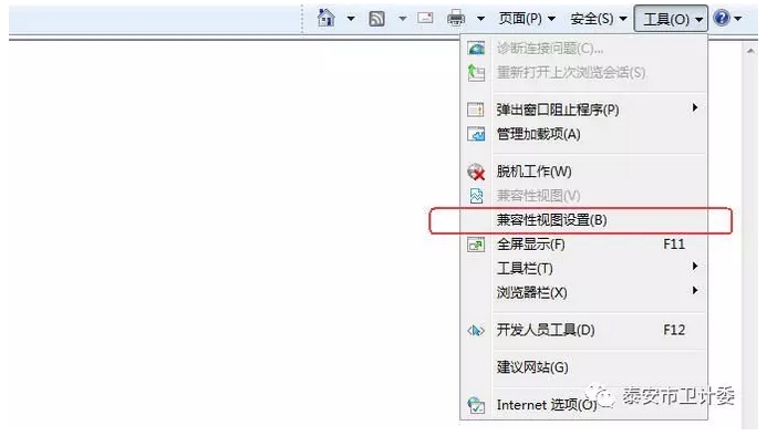 在菜單中選擇“工具->兼容性視圖設(shè)置”,如下圖:
