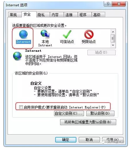 2. 選擇“安全”TAB頁,點擊“Internet”,去掉“啟用保護(hù)模式”選項的對號,點“應(yīng)用”按鈕,如下圖: