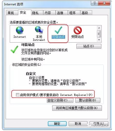 3. 選擇“安全”TAB頁,點擊“可信站點”,去掉“啟用保護(hù)模式”選項的對號,點“應(yīng)用”按鈕,如下圖: