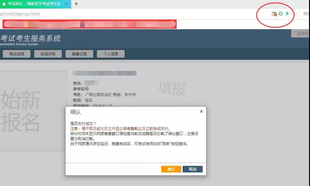 繳費(fèi)過(guò)程中常見(jiàn)的問(wèn)題為瀏覽器攔截,請(qǐng)參照下圖中的提示,點(diǎn)擊數(shù)字“1”,選擇允許網(wǎng)站彈出提示即可解決。